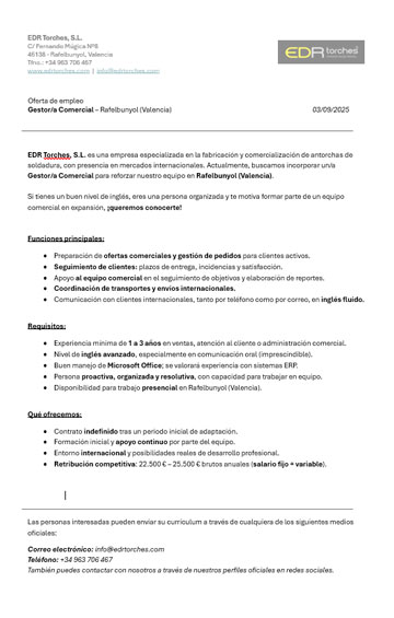 • Buscamos Gestor/a Comecial para Rafelbunyol 10 septiembre, 2025